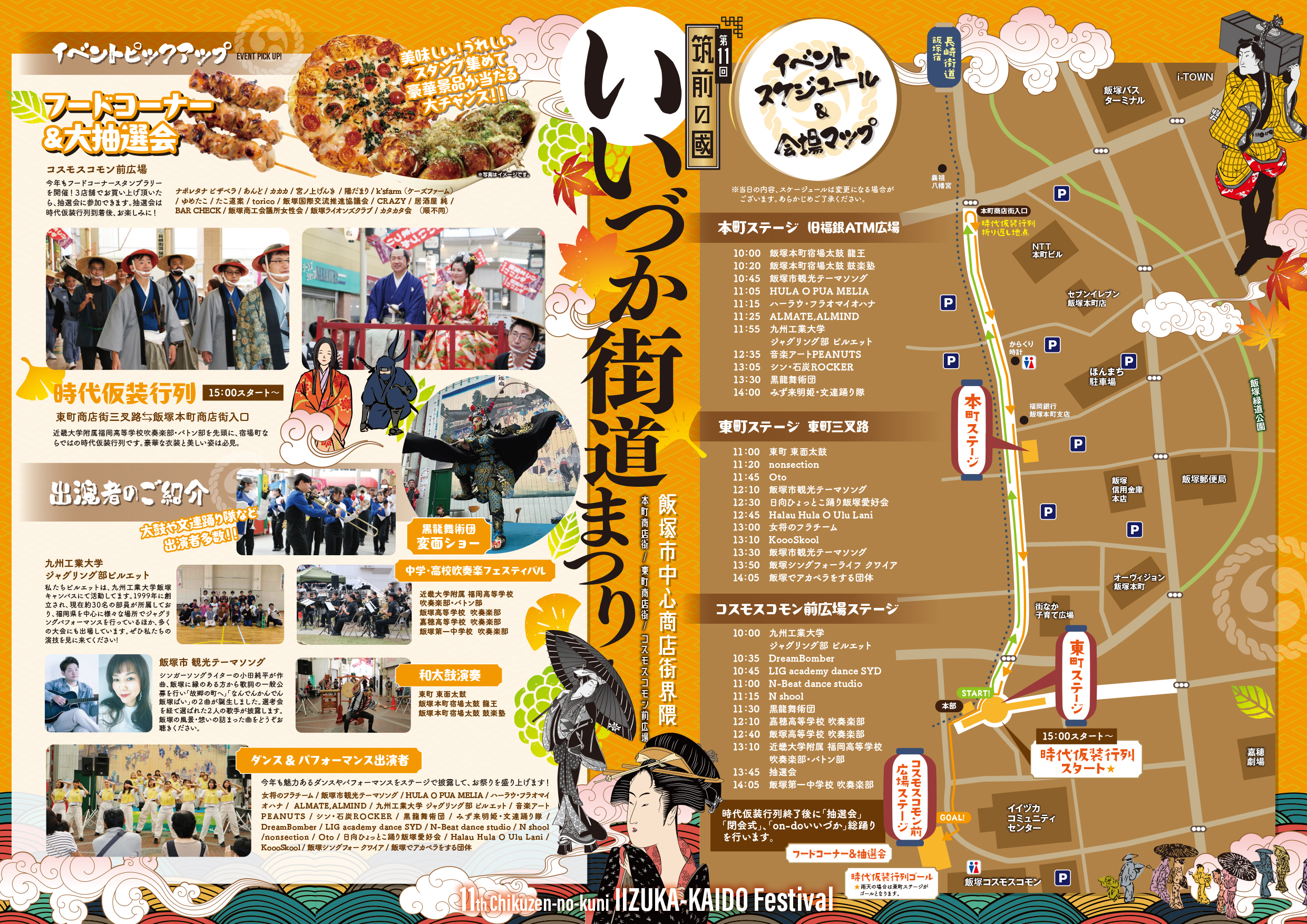 大勢の参加者による時代仮装行列やステージイベント、多数のフードコーナーなど、笑顔の絶えない企画が盛りだくさんです。最後は豪華景品が当たる抽選会。みんなで「on-doいいづか」総踊りを踊りましょう。皆さま奮ってご参加ください!